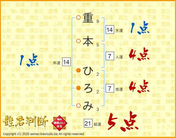 生活面を象徴する運勢です。外部から受ける影響力を表し、結婚運、家庭運や職場、環境への順応性を表します。総運から人運を引いた画数。姓や名が1文字の場合を除く。