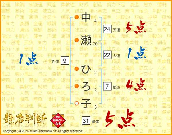 中瀬ひろ子さんの総運は31画の5点!