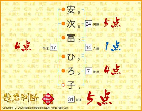 安(6画)次(6画)富(12画) ひ(2画)ろ(2画)子(3画)