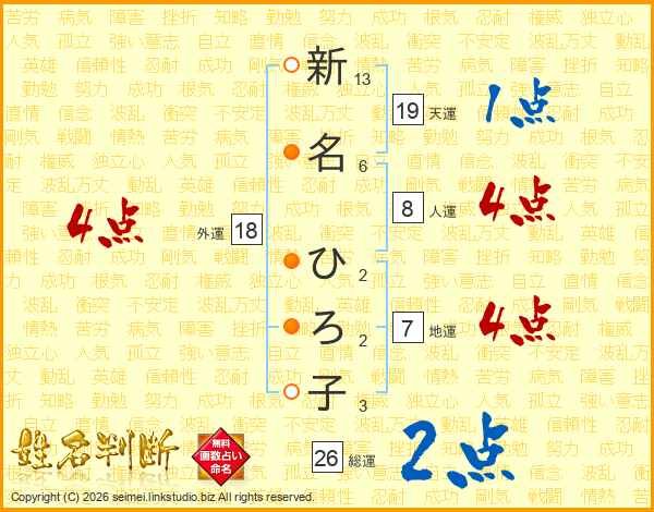 新(13画)名(6画) ひ(2画)ろ(2画)子(3画)