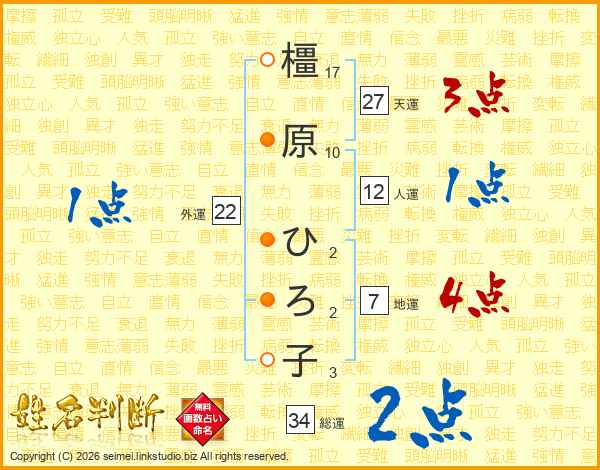 橿原ひろ子さんの天運は27画の3点!