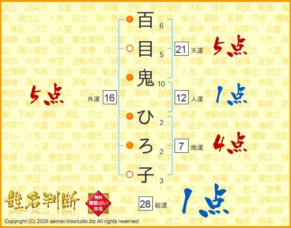 百目鬼ひろ子さんの総運は28画の1点!