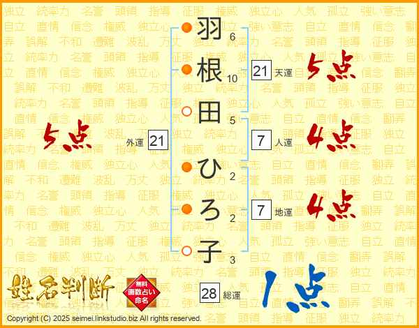 羽(6画)根(10画)田(5画) ひ(2画)ろ(2画)子(3画)