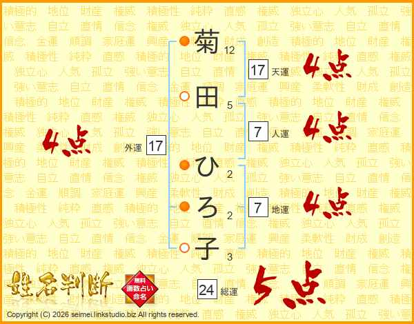 菊田ひろ子さんの外運は17画の4点!