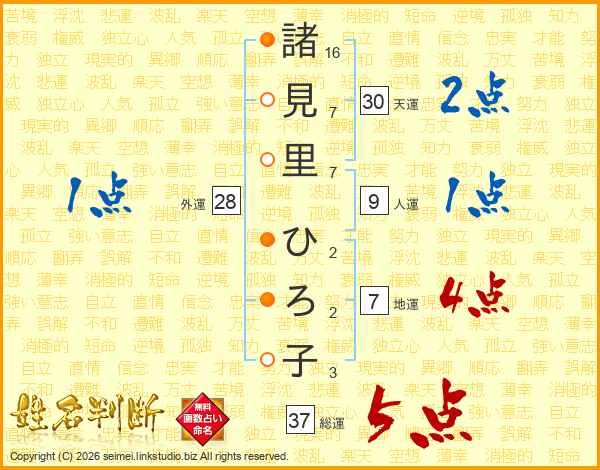 諸(16画)見(7画)里(7画) ひ(2画)ろ(2画)子(3画)