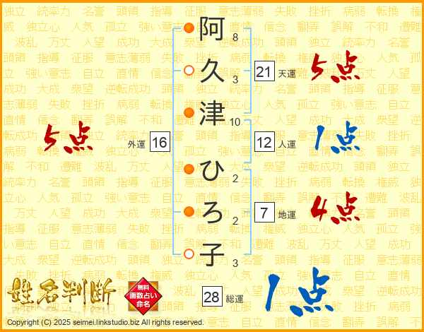 阿久津ひろ子さんの天運は21画の5点!