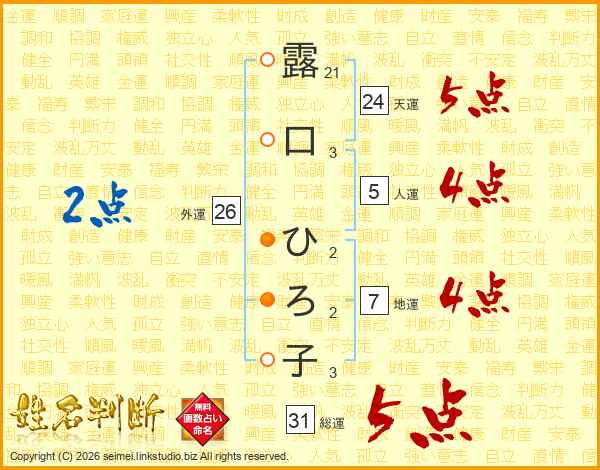 露(21画)口(3画) ひ(2画)ろ(2画)子(3画)
