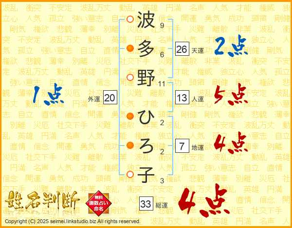 生活面を象徴する運勢です。外部から受ける影響力を表し、結婚運、家庭運や職場、環境への順応性を表します。総運から人運を引いた画数。姓や名が1文字の場合を除く。