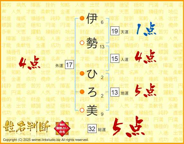 伊(6画)勢(13画) ひ(2画)ろ(2画)美(9画)