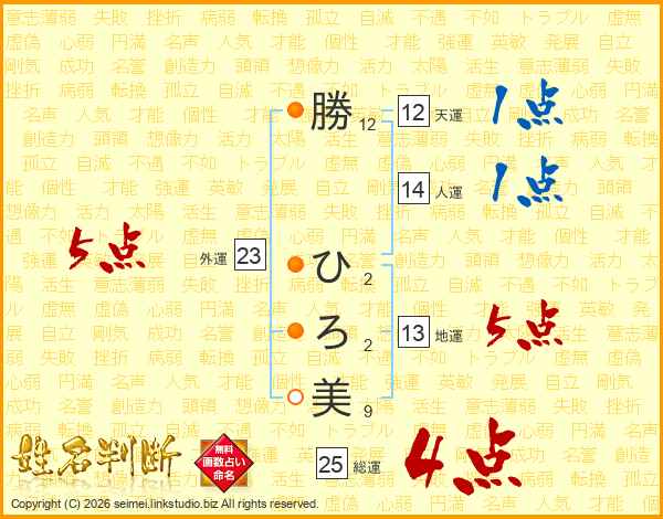 勝(12画) ひ(2画)ろ(2画)美(9画)