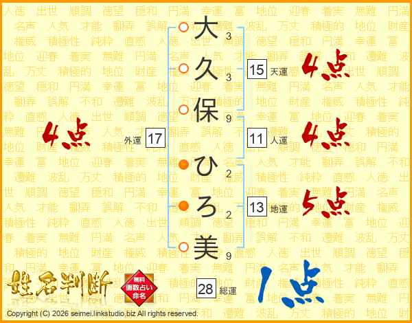 大(3画)久(3画)保(9画) ひ(2画)ろ(2画)美(9画)