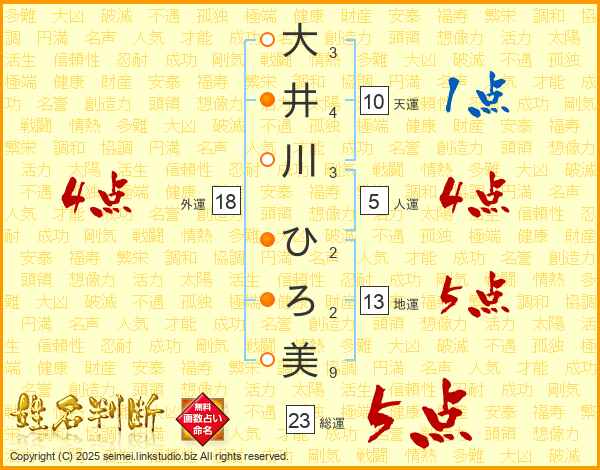 生活面を象徴する運勢です。外部から受ける影響力を表し、結婚運、家庭運や職場、環境への順応性を表します。総運から人運を引いた画数。姓や名が1文字の場合を除く。