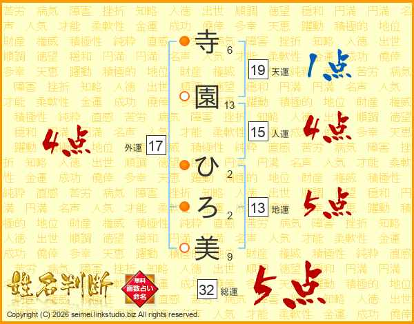 寺(6画)園(13画) ひ(2画)ろ(2画)美(9画)