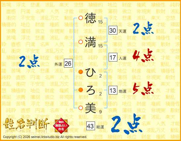徳(15画)満(15画) ひ(2画)ろ(2画)美(9画)