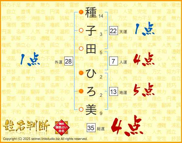 種(14画)子(3画)田(5画) ひ(2画)ろ(2画)美(9画)