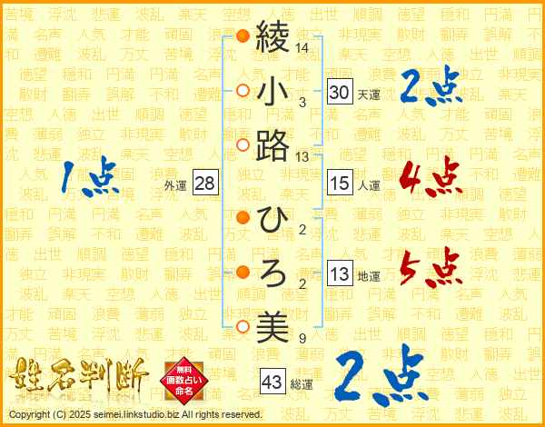 綾(14画)小(3画)路(13画) ひ(2画)ろ(2画)美(9画)