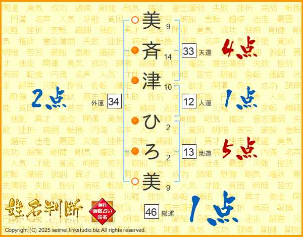 美(9画)斉(14画)津(10画) ひ(2画)ろ(2画)美(9画)