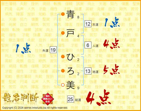青(8画)戸(4画) ひ(2画)ろ(2画)美(9画)