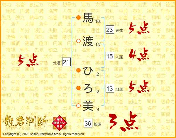 馬渡ひろ美さんの総運は36画の3点!