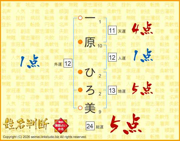 一(1画)原(10画) ひ(2画)ろ(2画)美(9画)