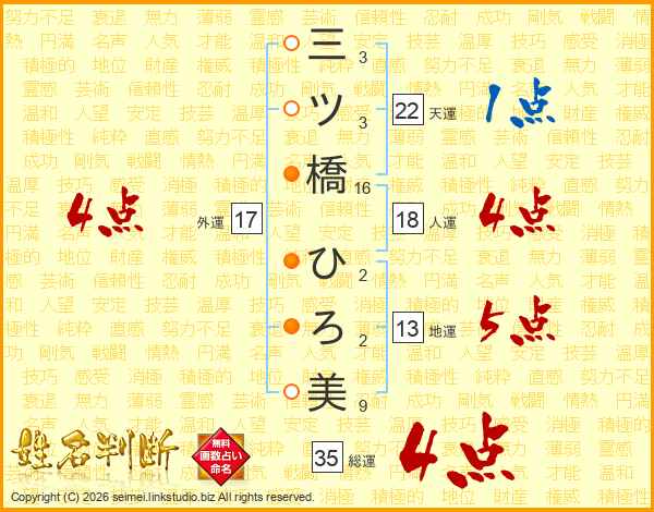 三ツ橋ひろ美さんの総運は35画の4点!