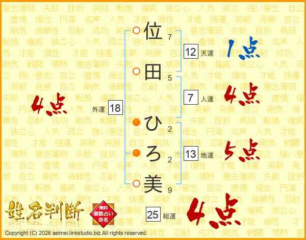 位(7画)田(5画) ひ(2画)ろ(2画)美(9画)