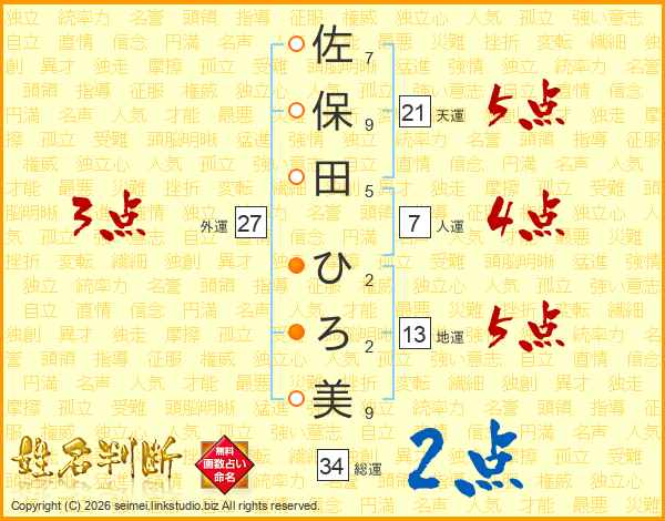 佐(7画)保(9画)田(5画) ひ(2画)ろ(2画)美(9画)