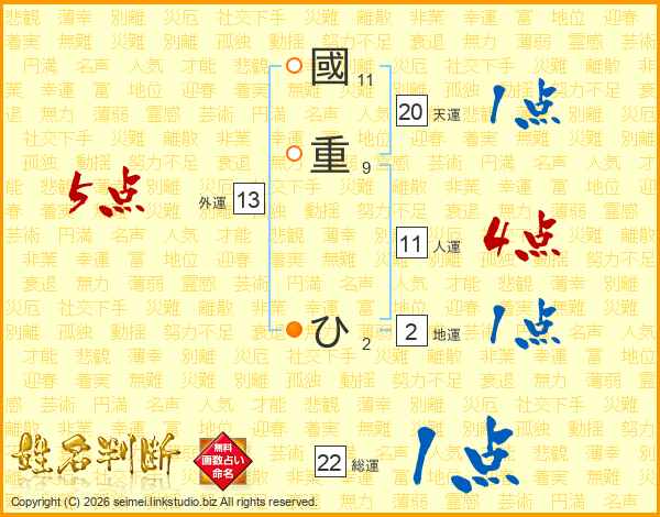 あなたの人生を表す1番重要な運勢です。生涯を通じて影響する総合運となり、主に50歳以降の晩年期に影響を及ぼします。苗字と名前の合計画数。