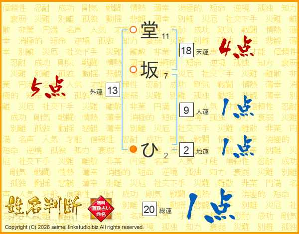 生活面を象徴する運勢です。外部から受ける影響力を表し、結婚運、家庭運や職場、環境への順応性を表します。総運から人運を引いた画数。姓や名が1文字の場合を除く。