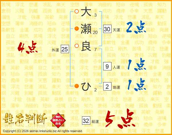 大(3画)瀬(20画)良(7画) ひ(2画)