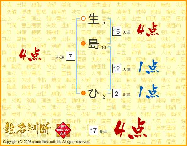 生活面を象徴する運勢です。外部から受ける影響力を表し、結婚運、家庭運や職場、環境への順応性を表します。総運から人運を引いた画数。姓や名が1文字の場合を除く。