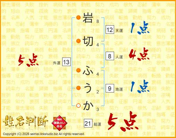 岩(8画)切(4画) ふ(4画)う(2画)か(3画)
