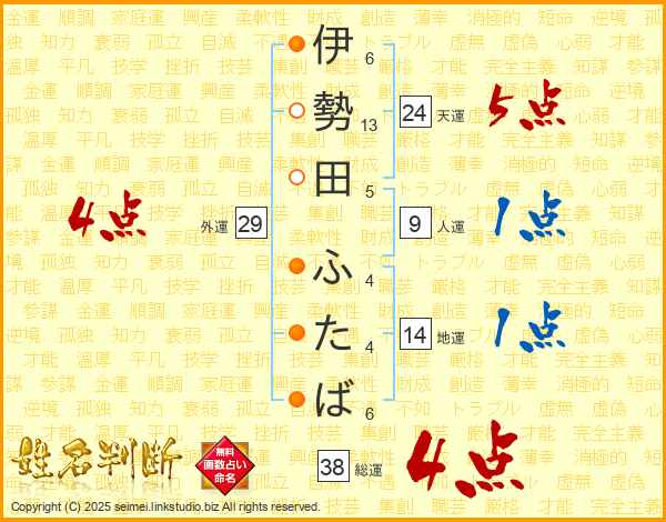 生活面を象徴する運勢です。外部から受ける影響力を表し、結婚運、家庭運や職場、環境への順応性を表します。総運から人運を引いた画数。姓や名が1文字の場合を除く。