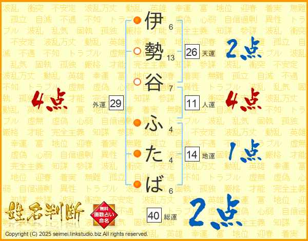 伊(6画)勢(13画)谷(7画) ふ(4画)た(4画)ば(6画)