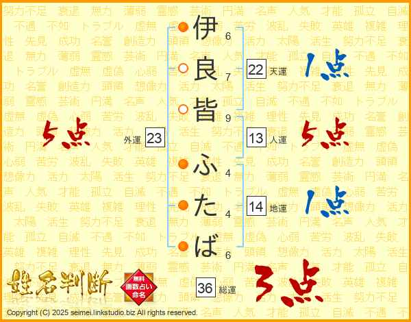 伊(6画)良(7画)皆(9画) ふ(4画)た(4画)ば(6画)