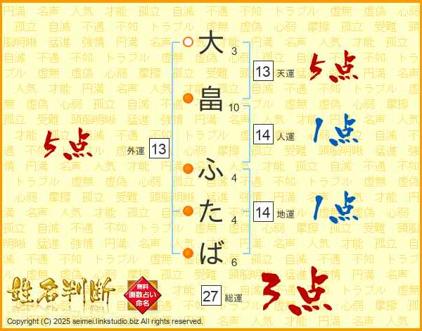 生活面を象徴する運勢です。外部から受ける影響力を表し、結婚運、家庭運や職場、環境への順応性を表します。総運から人運を引いた画数。姓や名が1文字の場合を除く。
