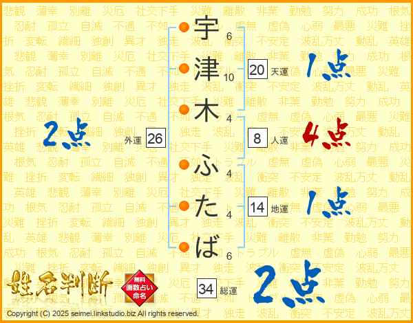 宇(6画)津(10画)木(4画) ふ(4画)た(4画)ば(6画)