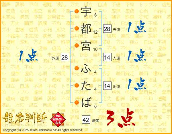 生活面を象徴する運勢です。外部から受ける影響力を表し、結婚運、家庭運や職場、環境への順応性を表します。総運から人運を引いた画数。姓や名が1文字の場合を除く。