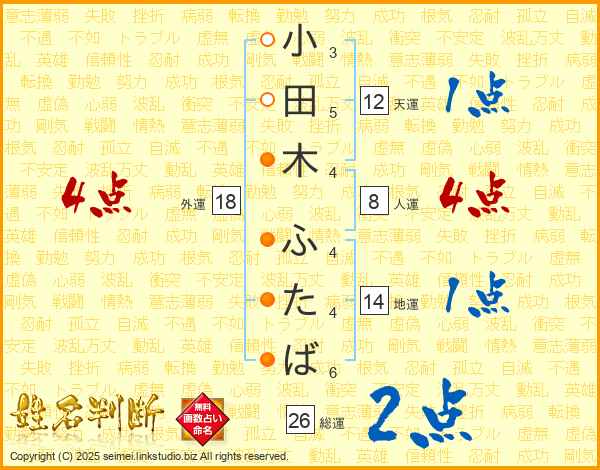 生活面を象徴する運勢です。外部から受ける影響力を表し、結婚運、家庭運や職場、環境への順応性を表します。総運から人運を引いた画数。姓や名が1文字の場合を除く。