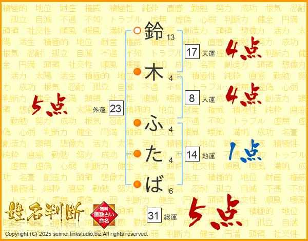 鈴(13画)木(4画) ふ(4画)た(4画)ば(6画)