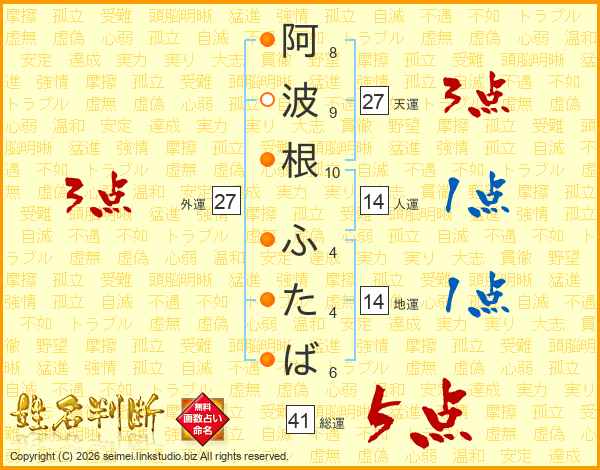 阿(8画)波(9画)根(10画) ふ(4画)た(4画)ば(6画)