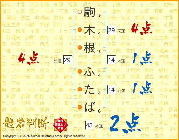 駒(15画)木(4画)根(10画) ふ(4画)た(4画)ば(6画)