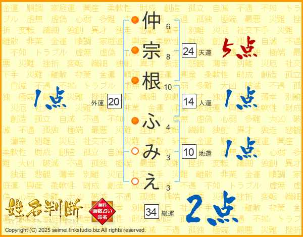 仲(6画)宗(8画)根(10画) ふ(4画)み(3画)え(3画)