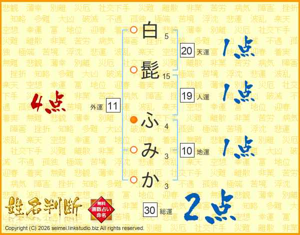 画数の奇数(○陽)と偶数(●陰)の配列で吉凶を占います。どちらかにかたよる名前は大凶名で避ける必要があります。画数の奇数偶数。