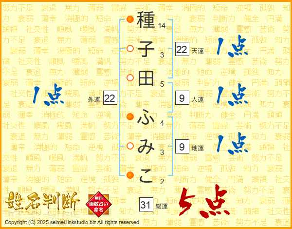 種子田ふみこさんの総運は31画の5点!