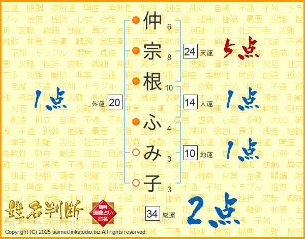 仲(6画)宗(8画)根(10画) ふ(4画)み(3画)子(3画)
