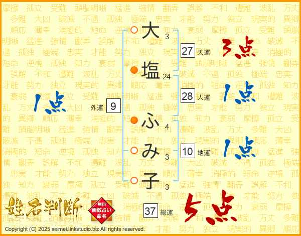 大(3画)塩(24画) ふ(4画)み(3画)子(3画)