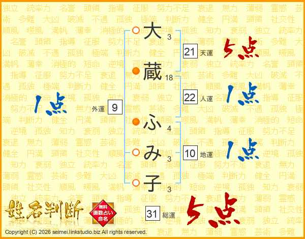 大(3画)蔵(18画) ふ(4画)み(3画)子(3画)