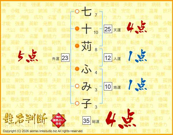 七(7画)十(10画)苅(8画) ふ(4画)み(3画)子(3画)