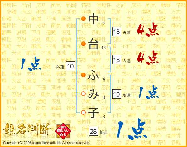 中(4画)台(14画) ふ(4画)み(3画)子(3画)